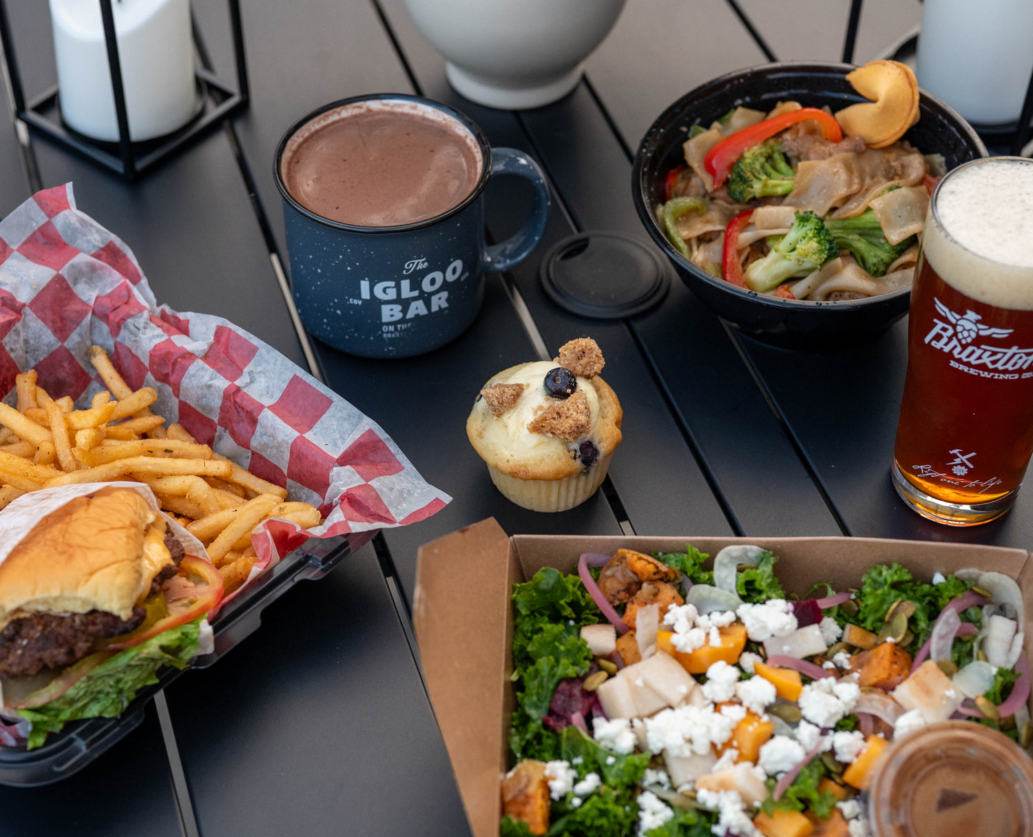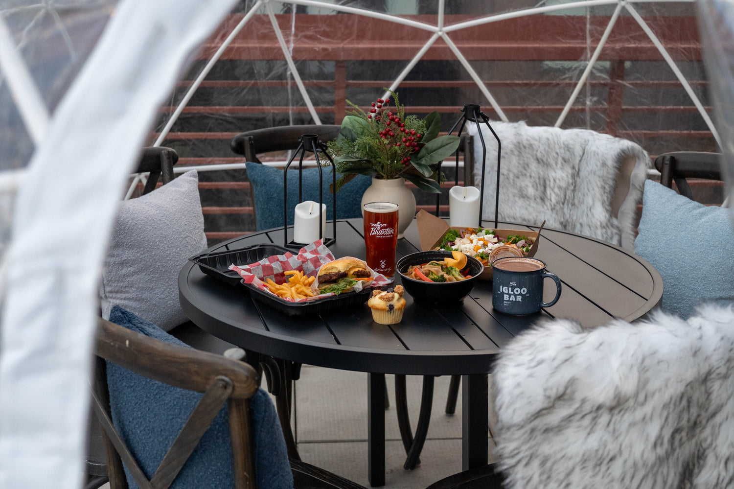 No outside food is permitted. We are excited to partner with the Factory 52 Gatherhall to get some piping hot pies delivered directly to your igloo. Orders will be placed via a QR code and brought to you.