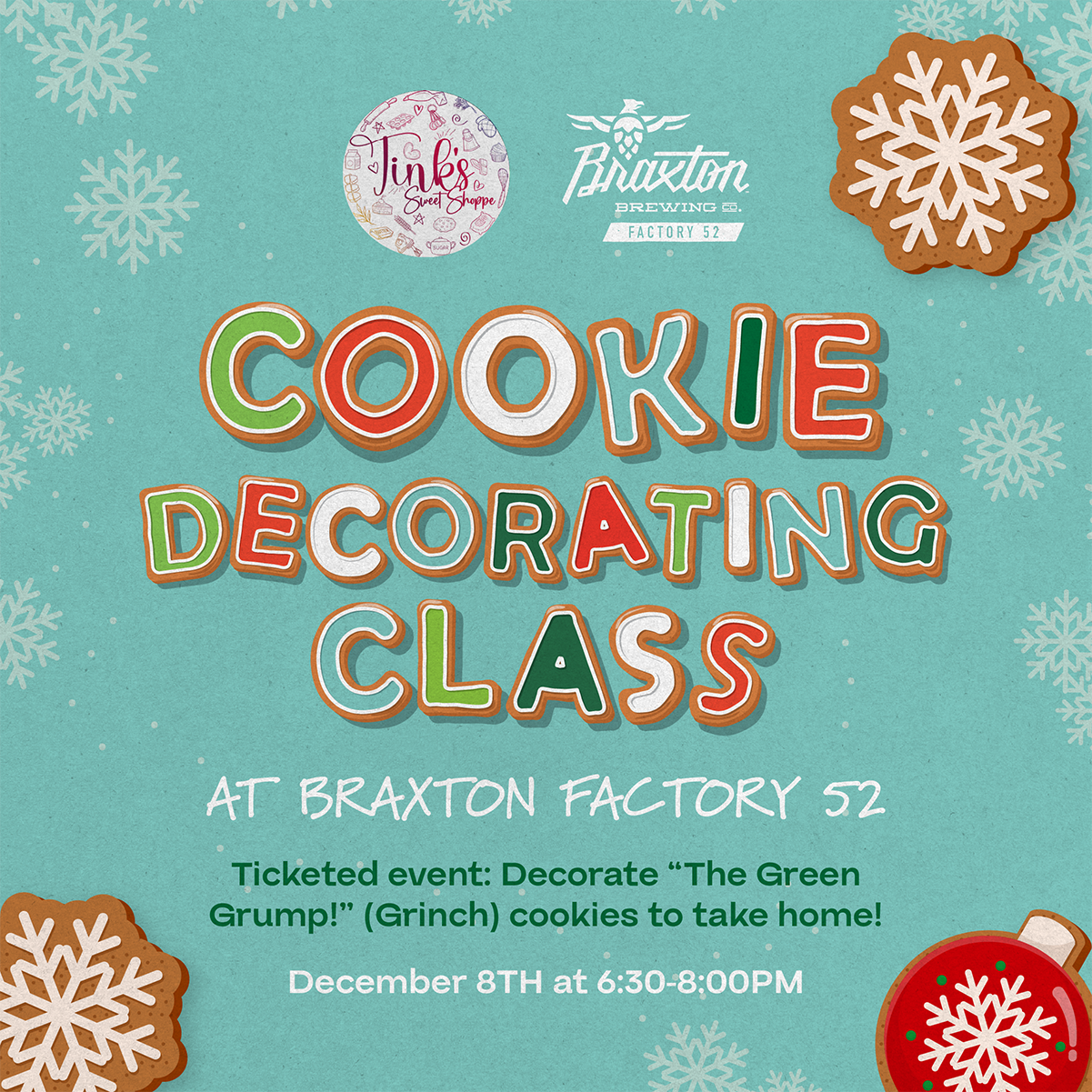 Join us at Braxton Factory 52 for a festive hands-on cookie-decorating experience this holiday season! We’re teaming up with local cookie artist Jenae’ Criswell, who will be bringing her famous Green Grump cookie set — a playful, Grinch-inspired collection that’s guaranteed to make your heart grow three sizes. You can join this Holiday Cookie Decorating Class at all Braxton Brewing Company taprooms this holiday season.